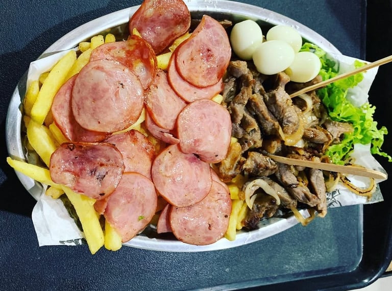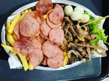 Filé de Frango, Filé de Carne, Batata, Calabresa, Ovo de Codorna e Cebola.